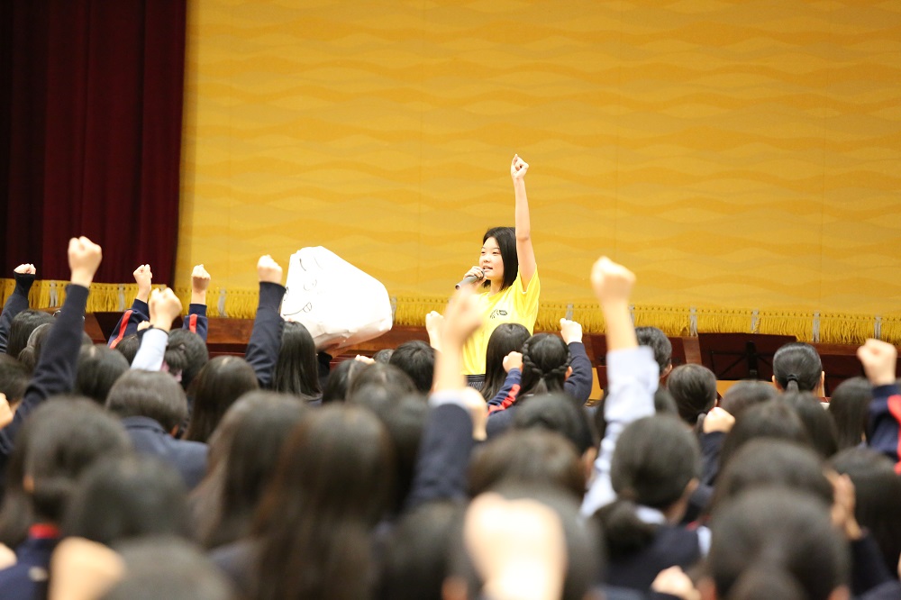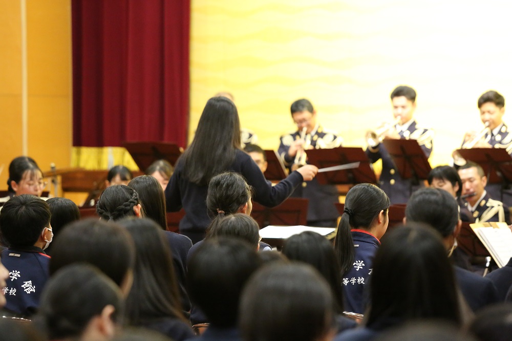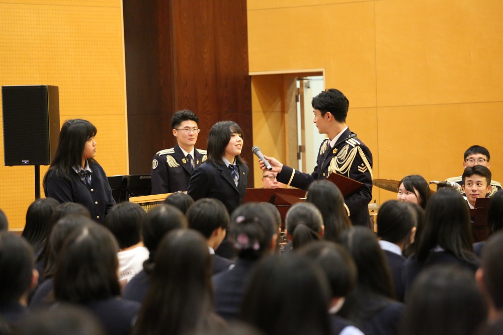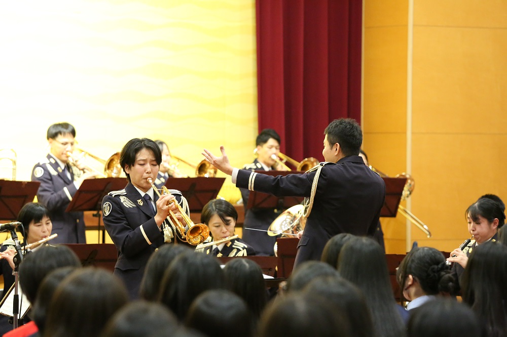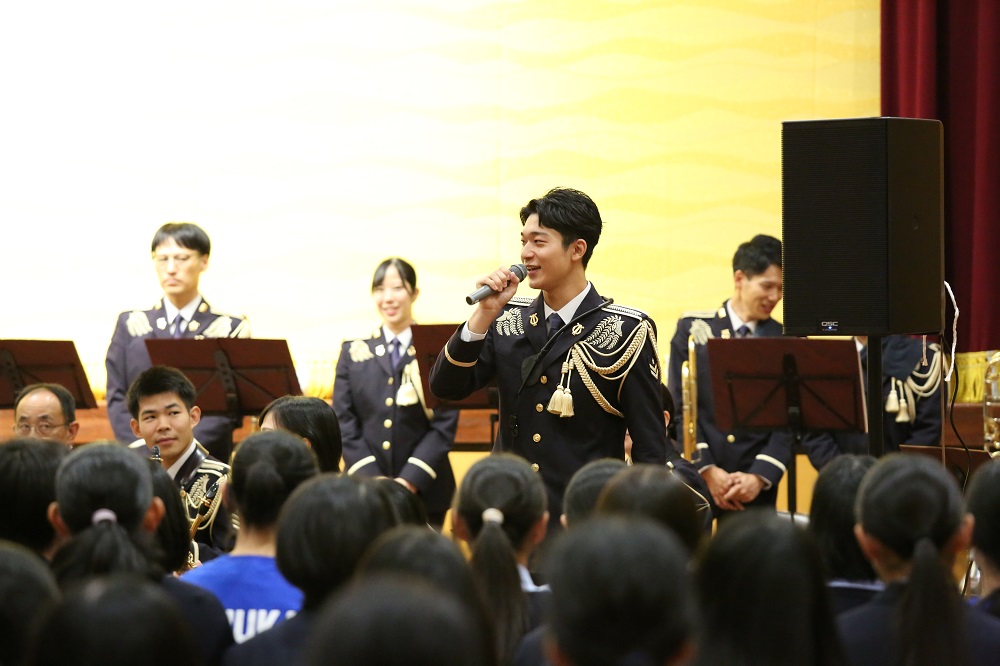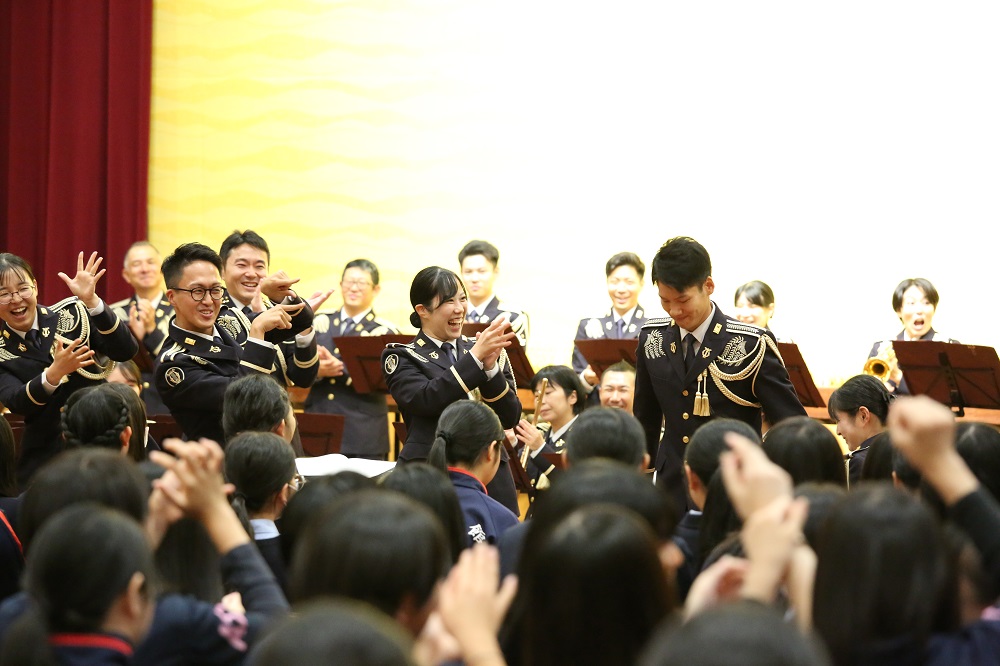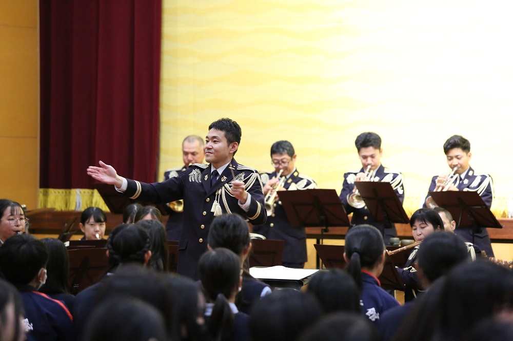 音楽隊による演奏の中では、実際に生徒が指揮を体験したり、吹奏楽部が音楽隊と一緒に演奏を行うなどしました!